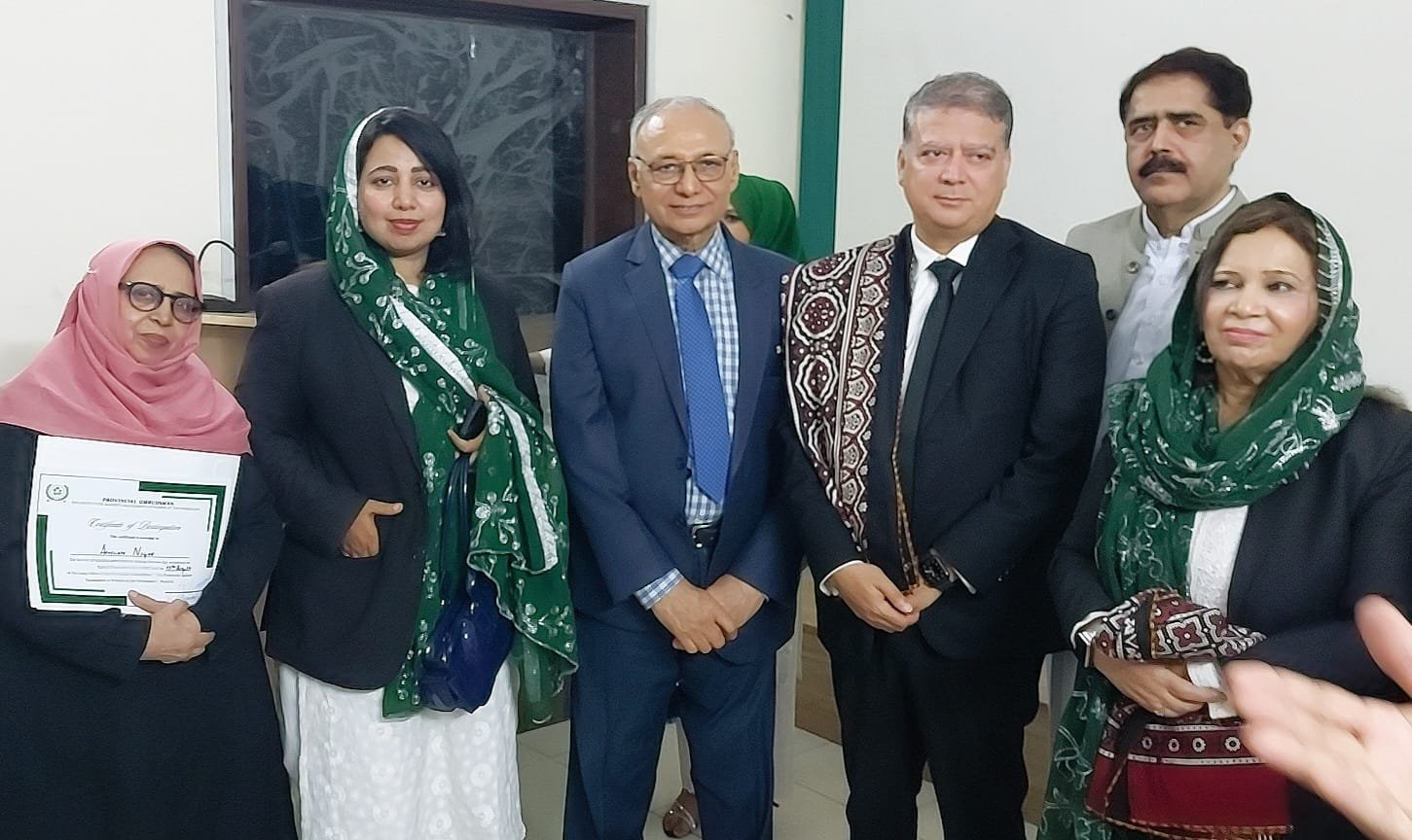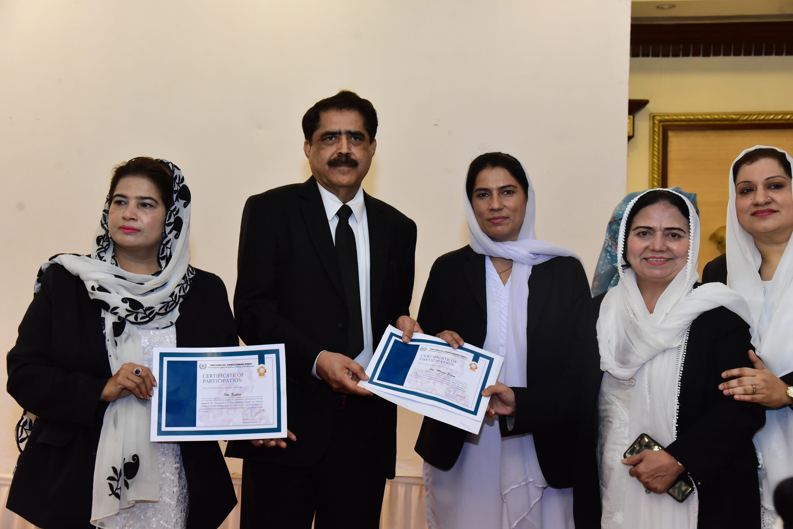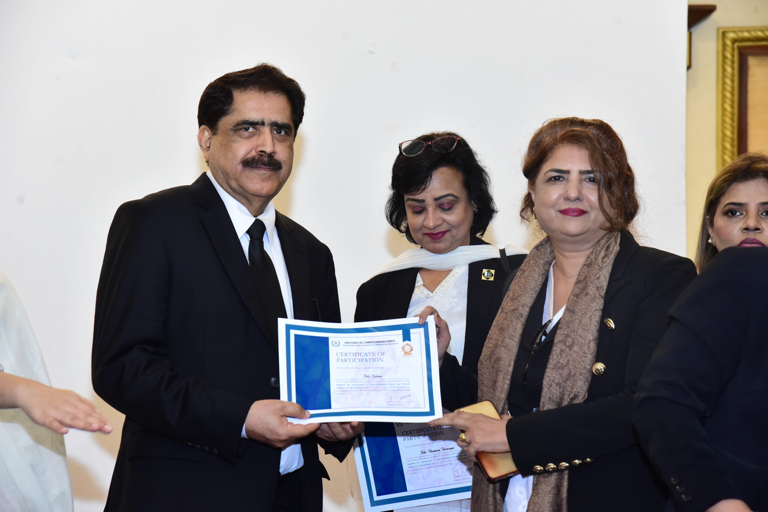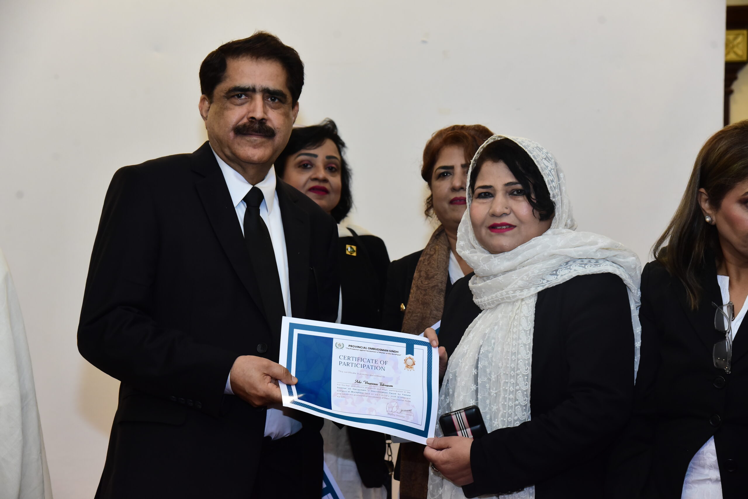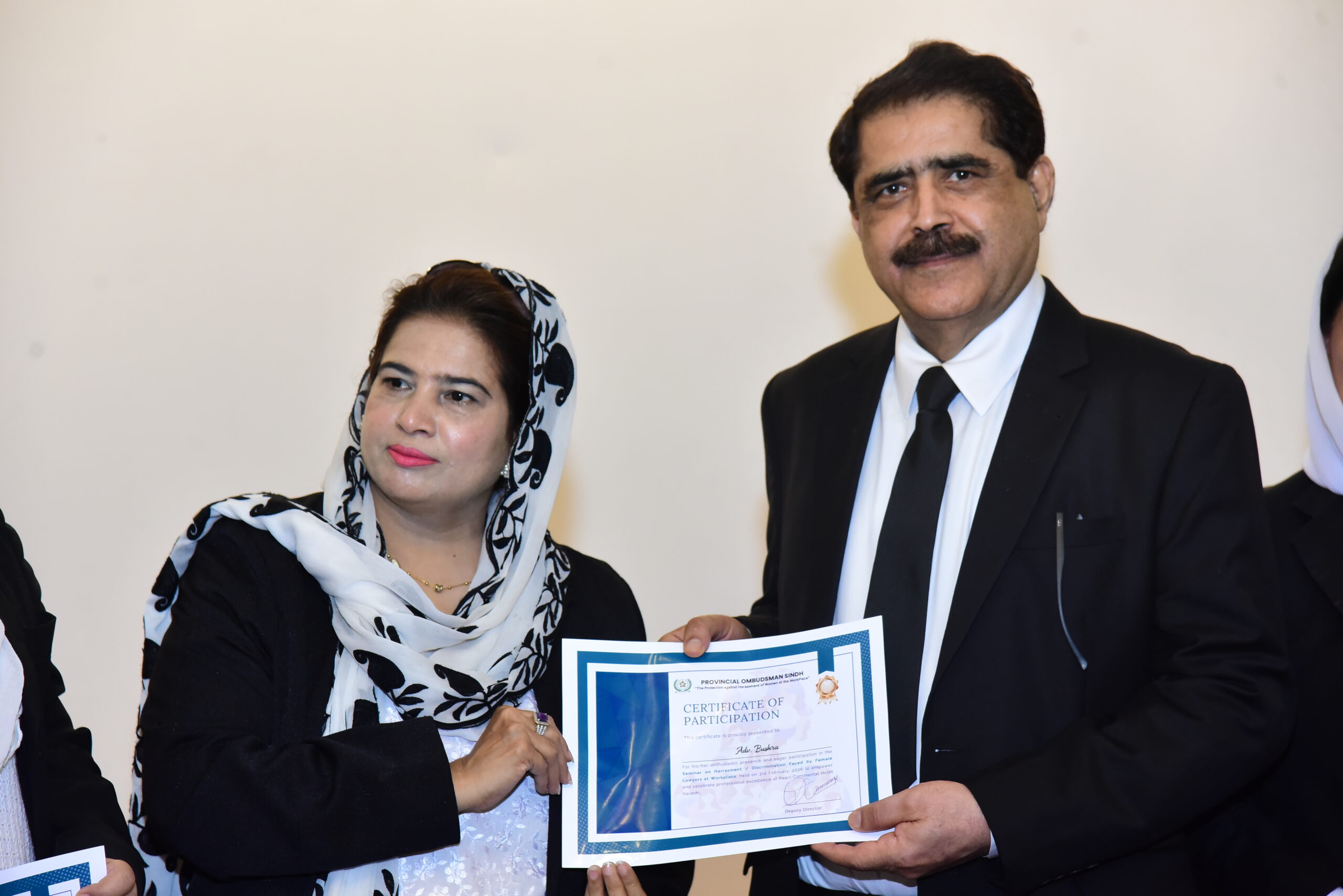 Mr. Manthar Ali Jatoi, (Consultant), Provincial Ombudsman (PHWWP) awarding Certificate to the Ms. Mumtaz Noorani, (Public Prosecutor) Provincial Ombudsman (PHWWP).