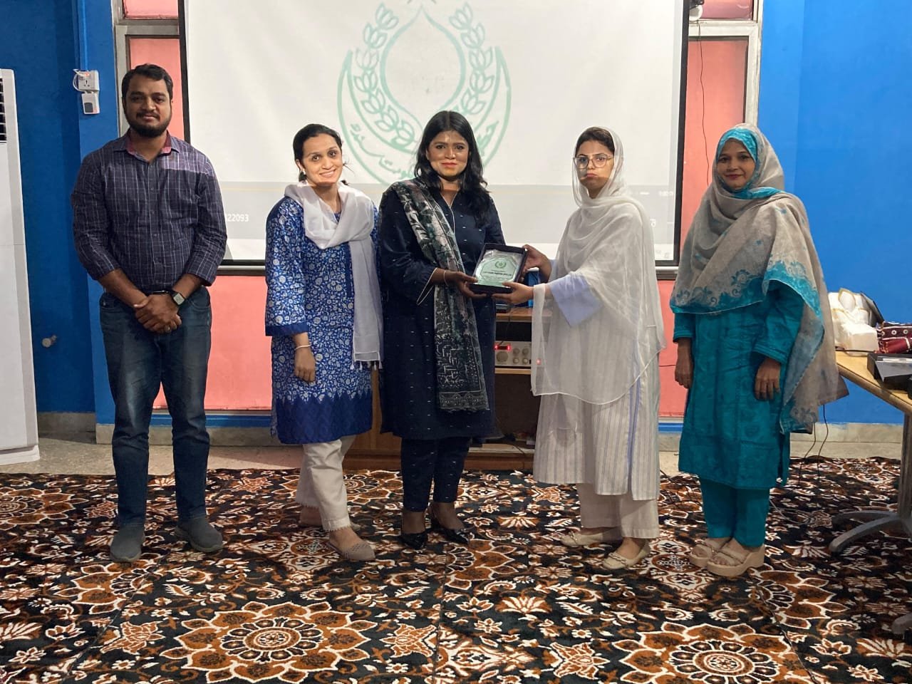 Ms. Zainab Shah, Assistant Director (Awareness) awarding Souvenir to the Guest, Ms. Humaira Bashir Ahmed, Assistant Education Officer Primary, District East Karachi.