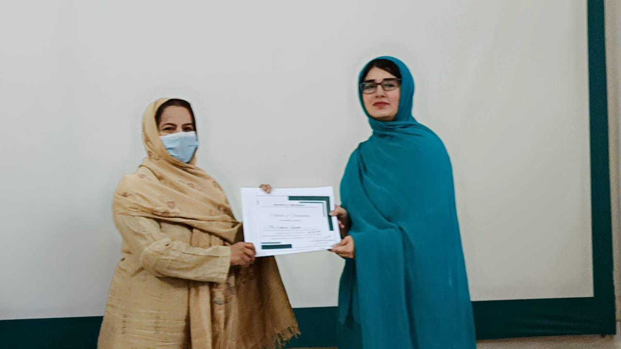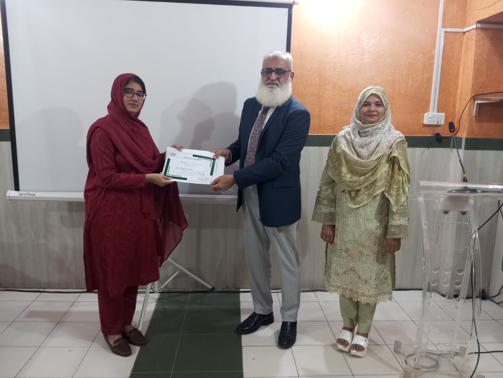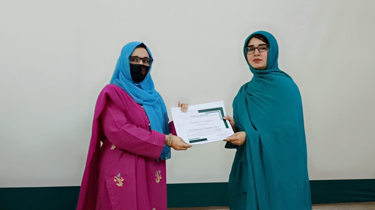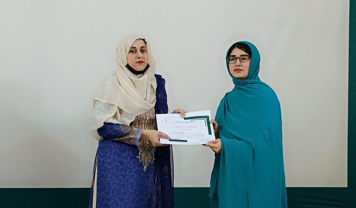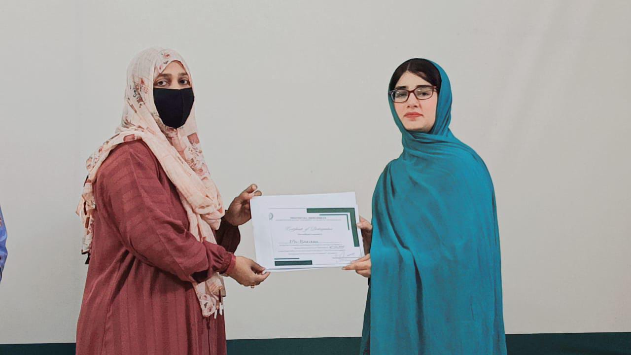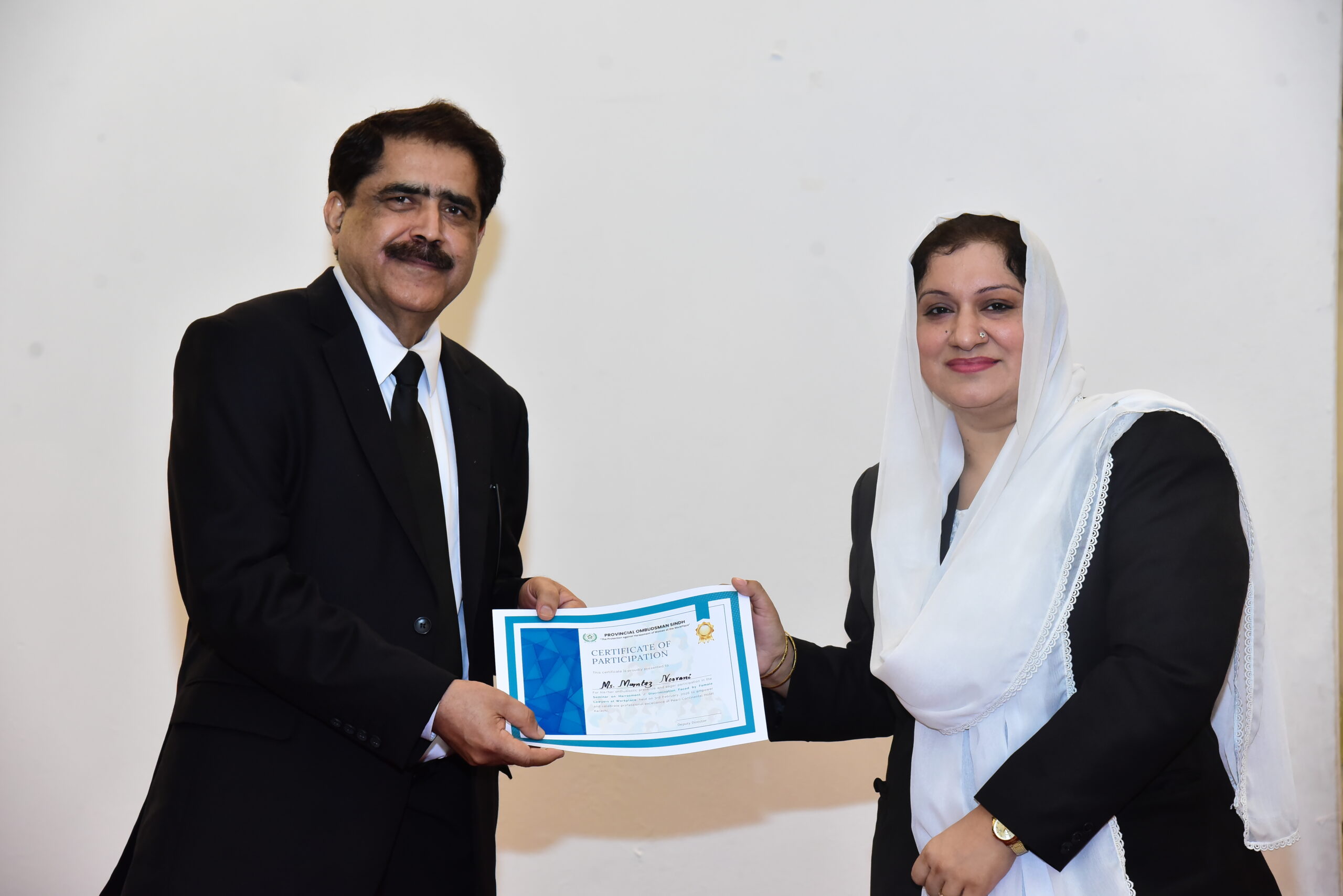 Ms. Zainab Shah, Assistant Director awarding Souvenir & Certificate to the participants.