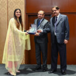 Mr. Manthar Ali Jatoi, (Consultant) and Mr. Bashir Ahmed Khoso, (Consultant) Provincial Ombudsman (PHWWP) presenting souvenirs to Fashion Designer, Owner of Fabricology by Naureen Abbas, Social Activist, Executive Director at NJE.