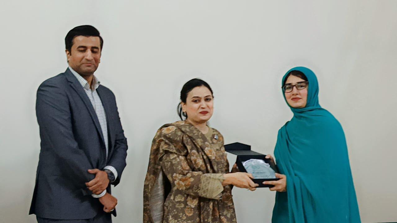 Mr. Manthar Ali Jatoi, (Consultant) and Mr. Bashir Ahmed Khoso, (Consultant) Provincial Ombudsman (PHWWP) presenting souvenirs to Ms. Ayat Shaikh, Play Back Singer.