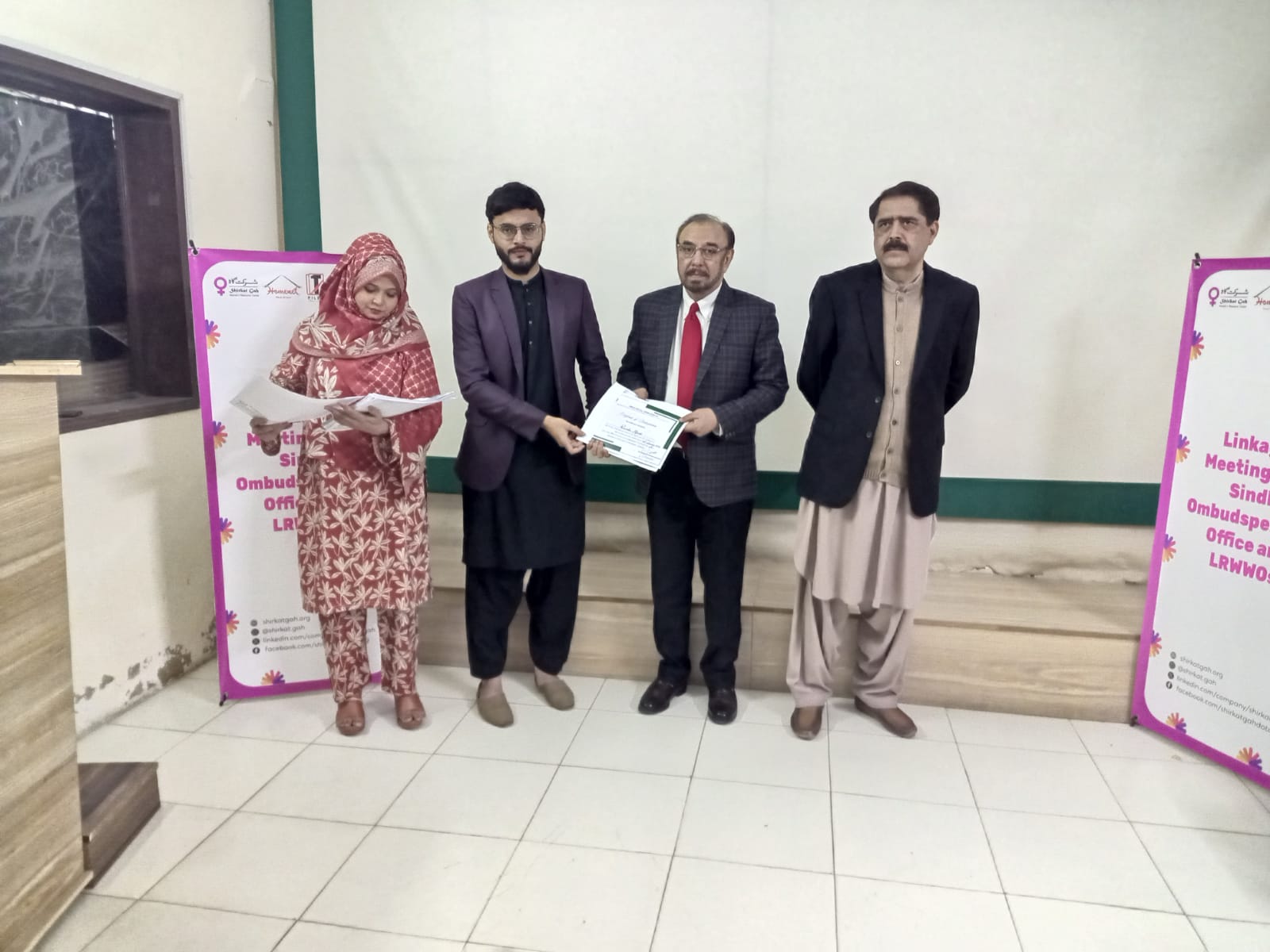 Hon’ble Justice (R) Shahnawaz Tariq (Provincial Ombudsman) with Mr. Manthar Ali Jatoi, District & Session Judge (Consultant), Mr. Bashir Ahmed Khoso, District & Session Judge (Consultant) & Mr. Muneer Ahmed Channa, Registrar, Provincial Ombudsman (PHWWP).