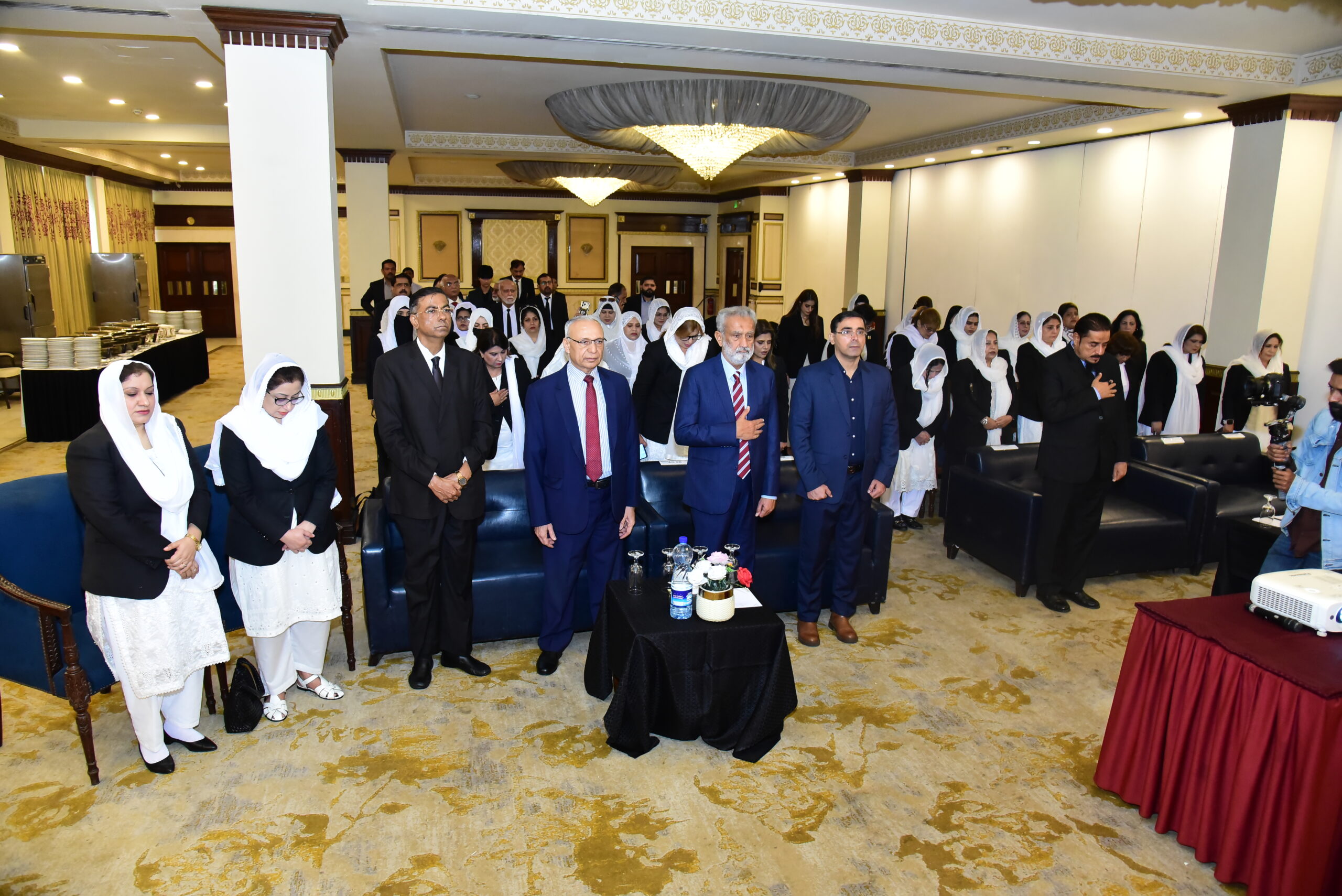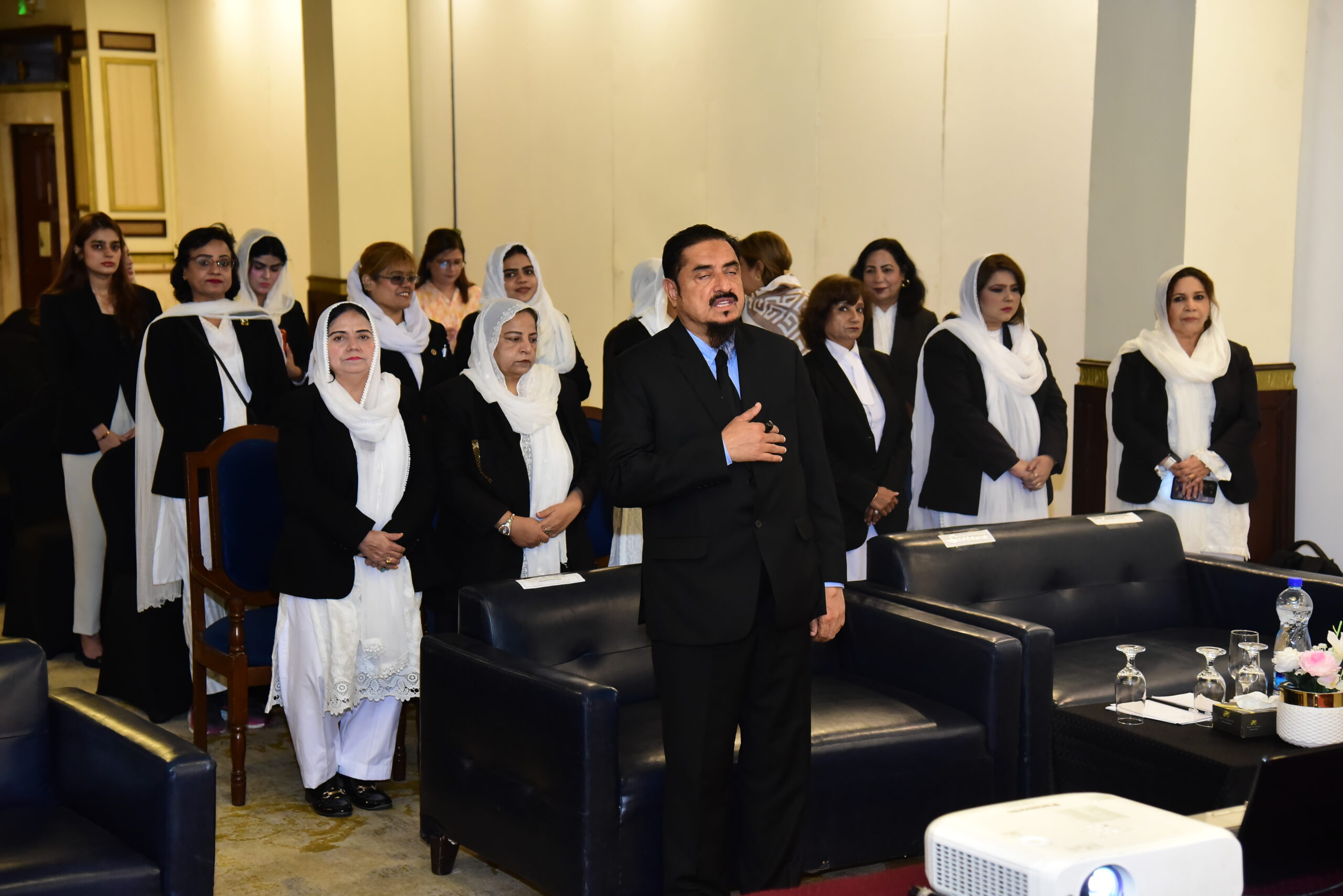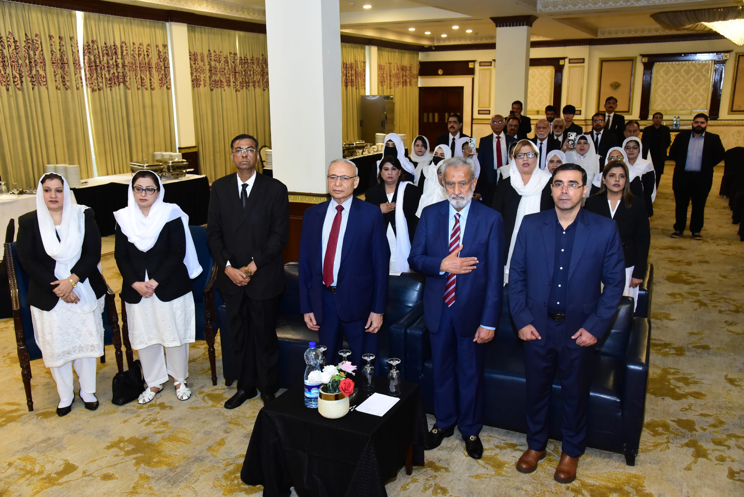 Honorable Ombudsman, Justice (R) Shahnawaz Tariq, Worthy Registrar, District & Session Judges (Consultant) and officers of Provincial Ombudsman (PHWWP) department standing in the honour of National Anthem of Pakistan.