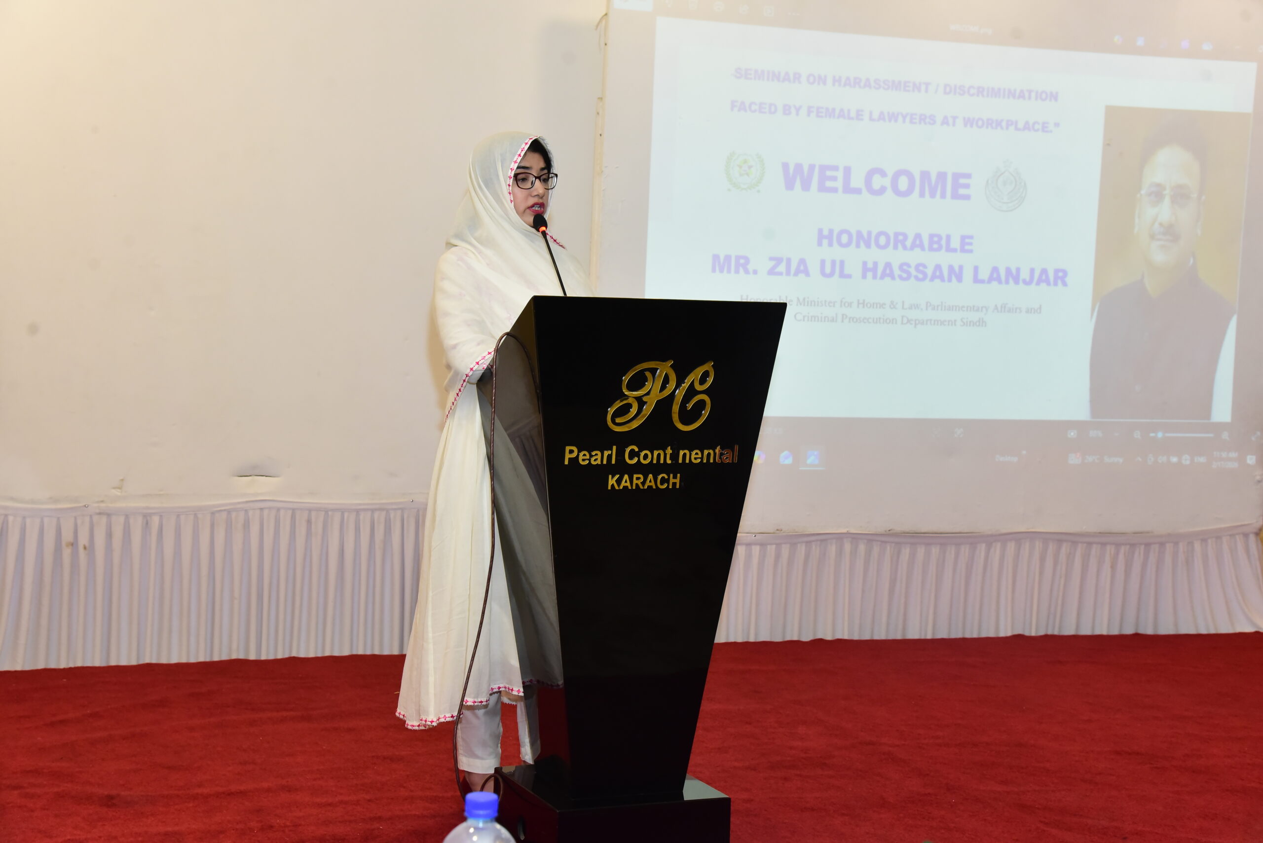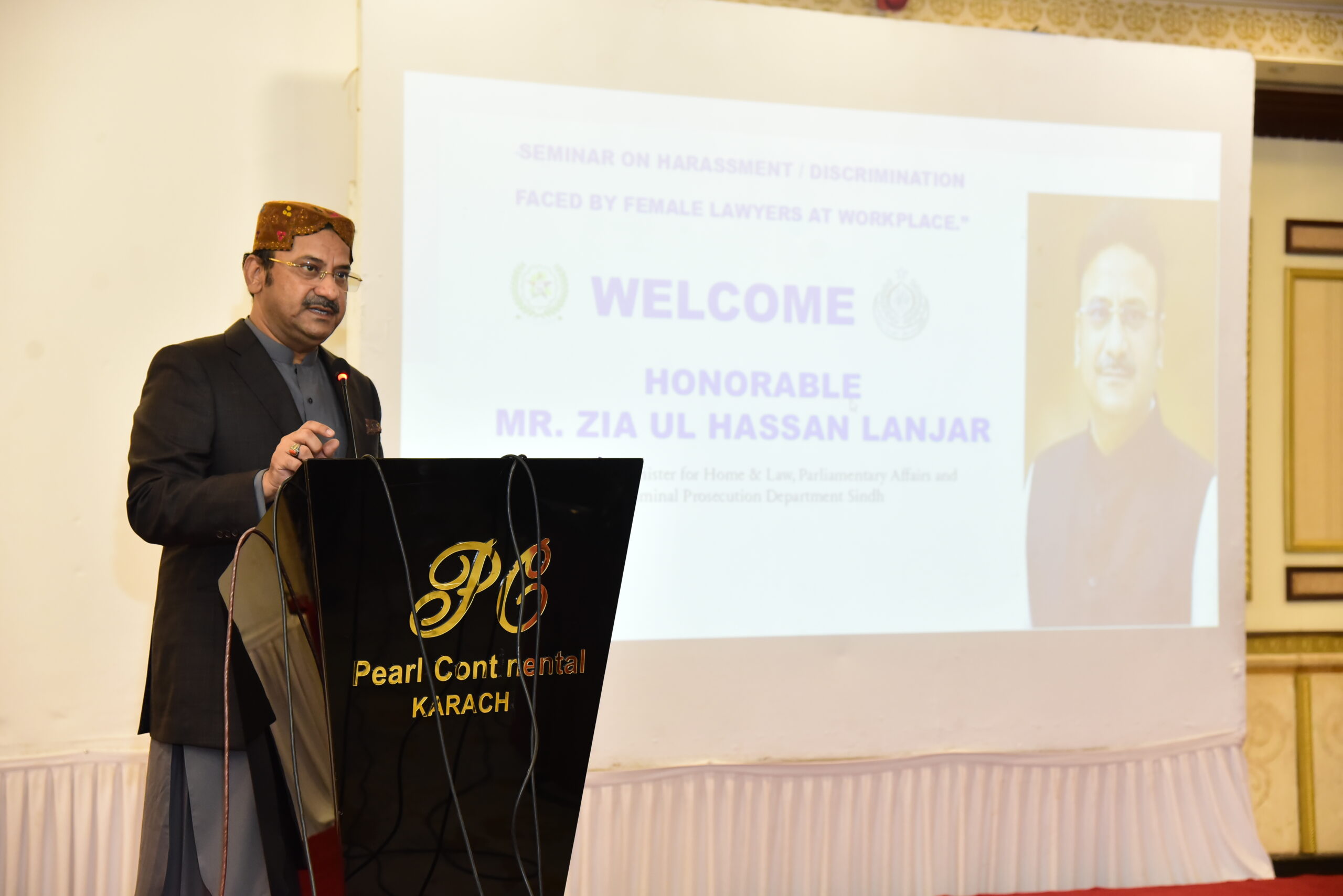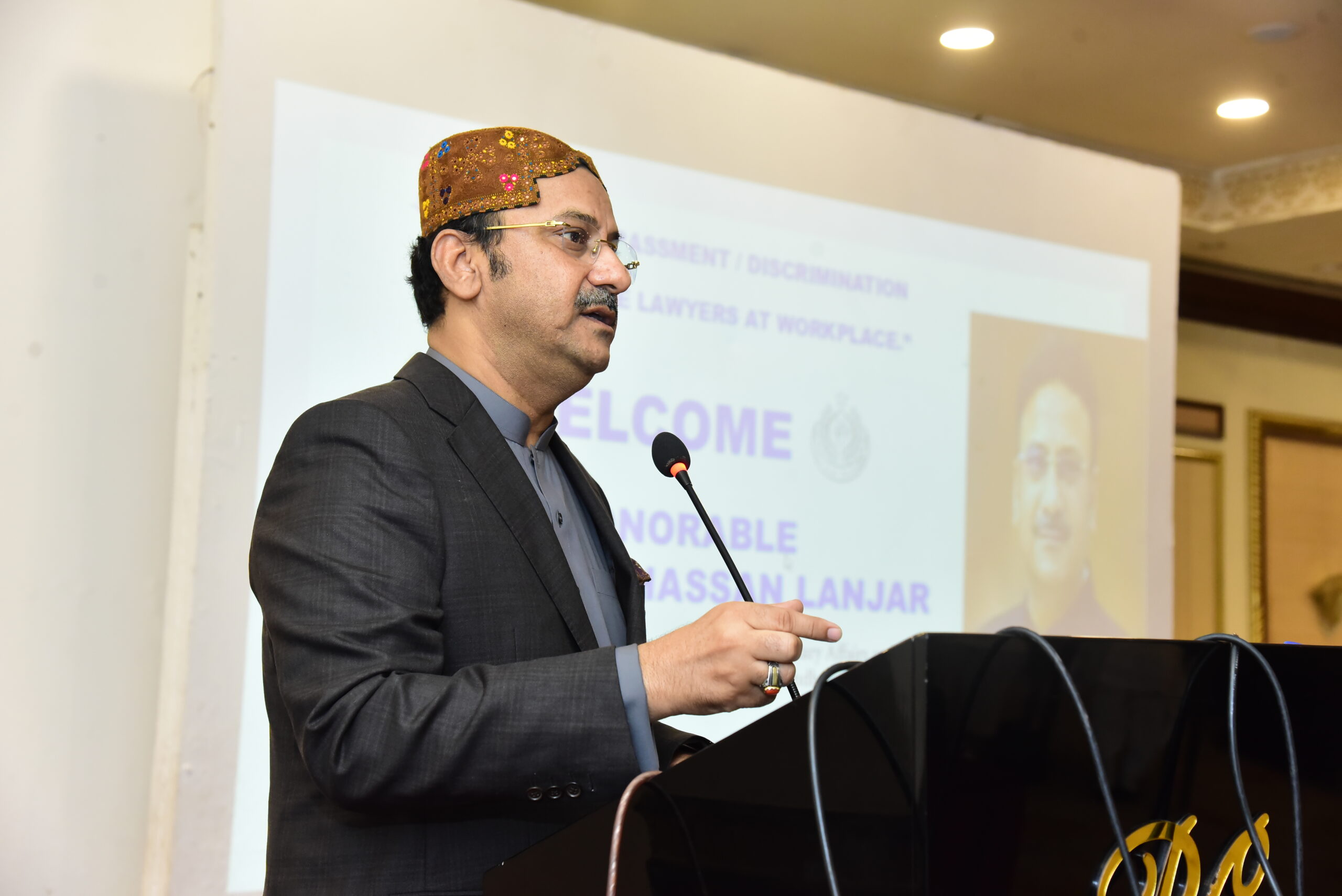 Honorable Mr. Zia Ul Hassan Lanjar, Honorable Minister for Home & Law, Parliamentary Affairs and Criminal Prosecution Department Sindh, presenting his invaluable views and insights on the Harassment / Discrimination Faced by Female Lawyers at the workplace.