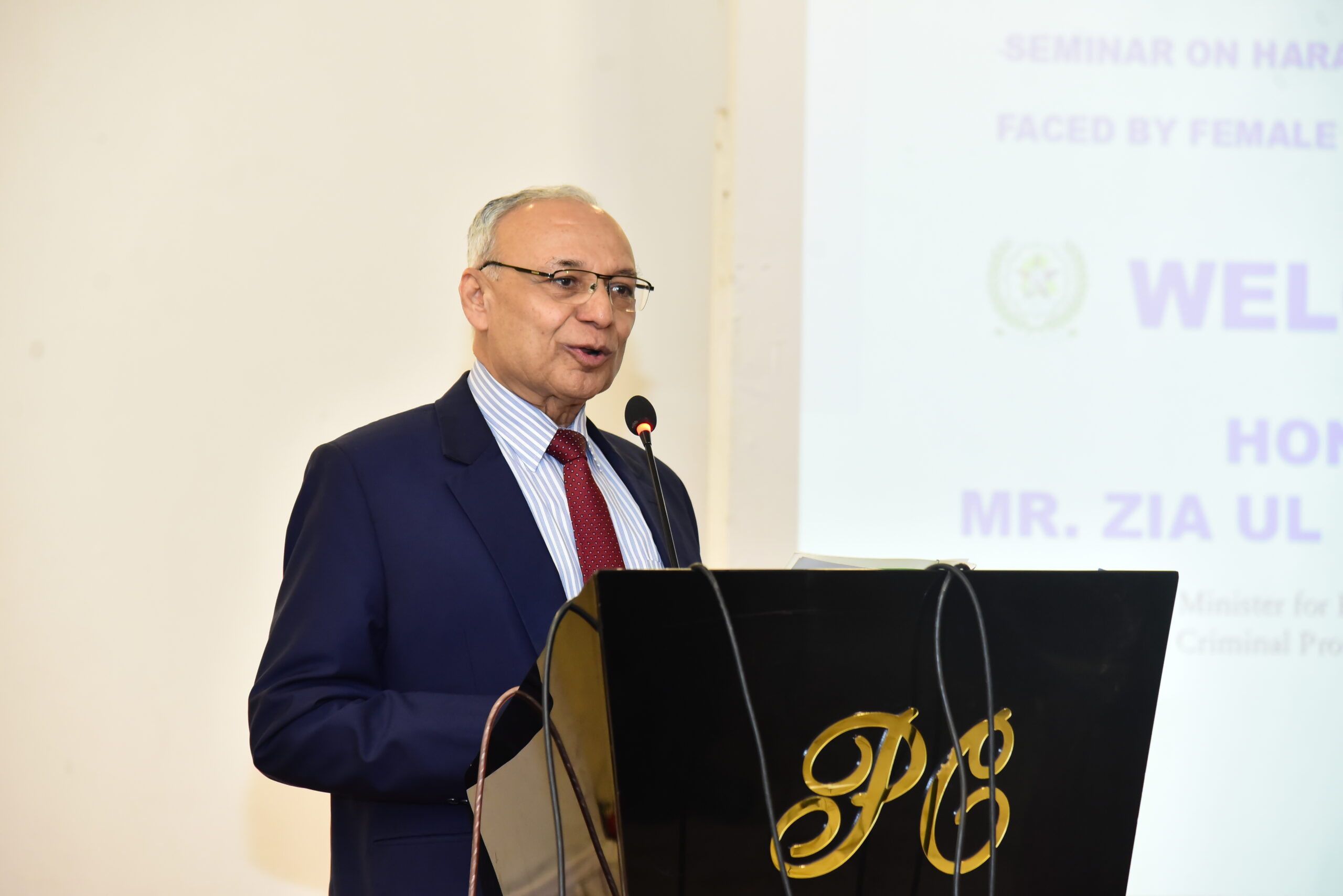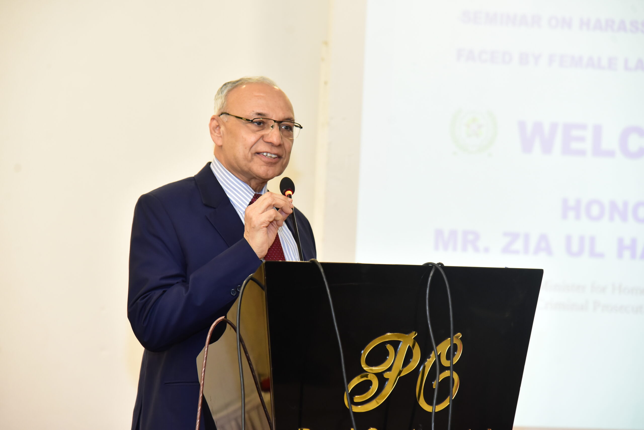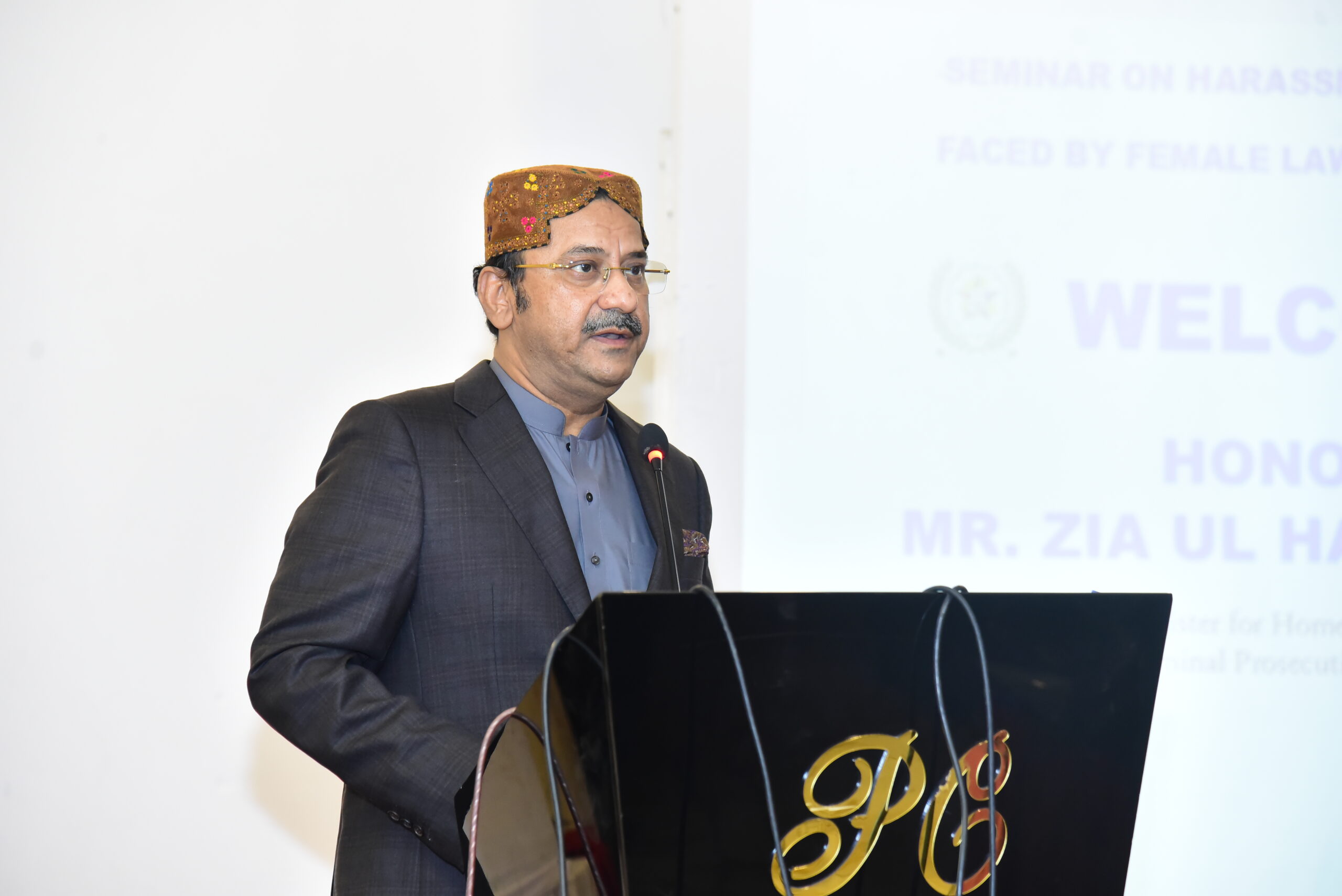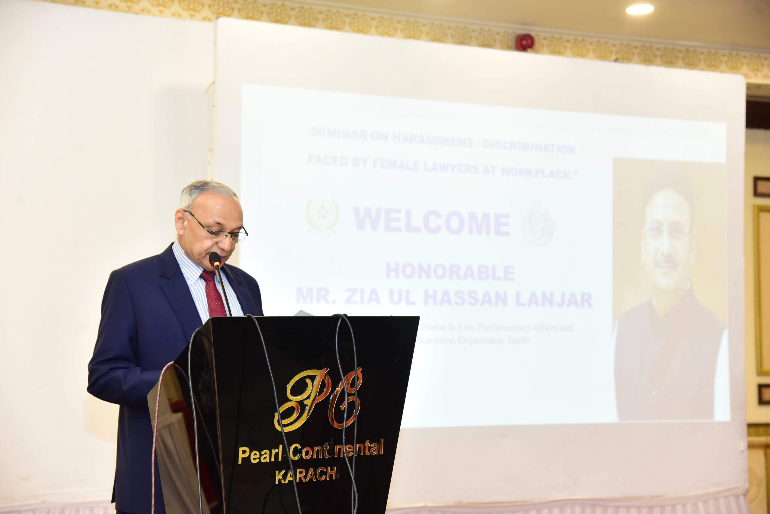 Honorable Mr. Zia Ul Hassan Lanjar, Honorable Minister for Home & Law, Parliamentary Affairs and Criminal Prosecution Department Sindh, presenting his invaluable views and insights on the Harassment / Discrimination Faced by Female Lawyers at the workplace.