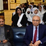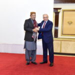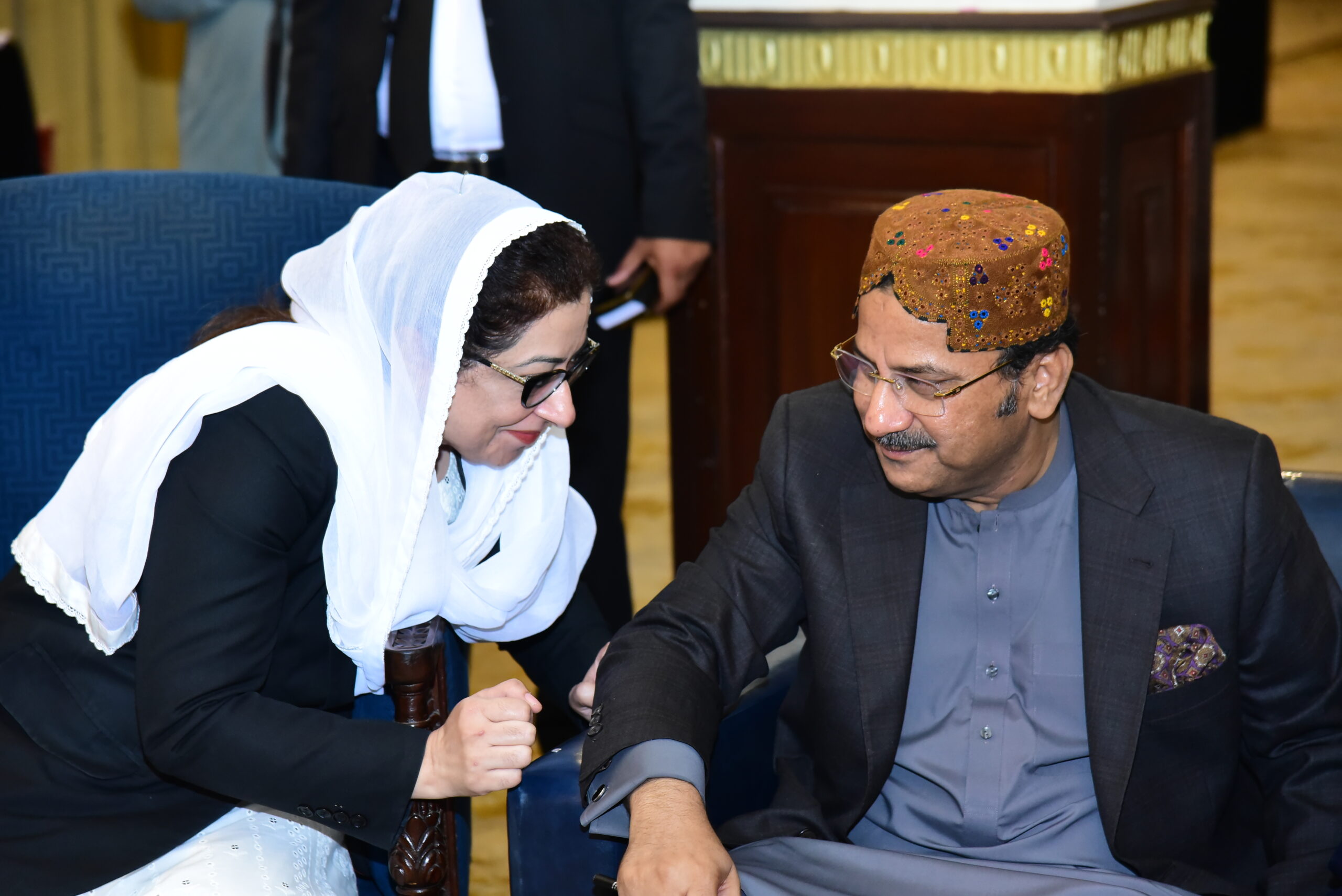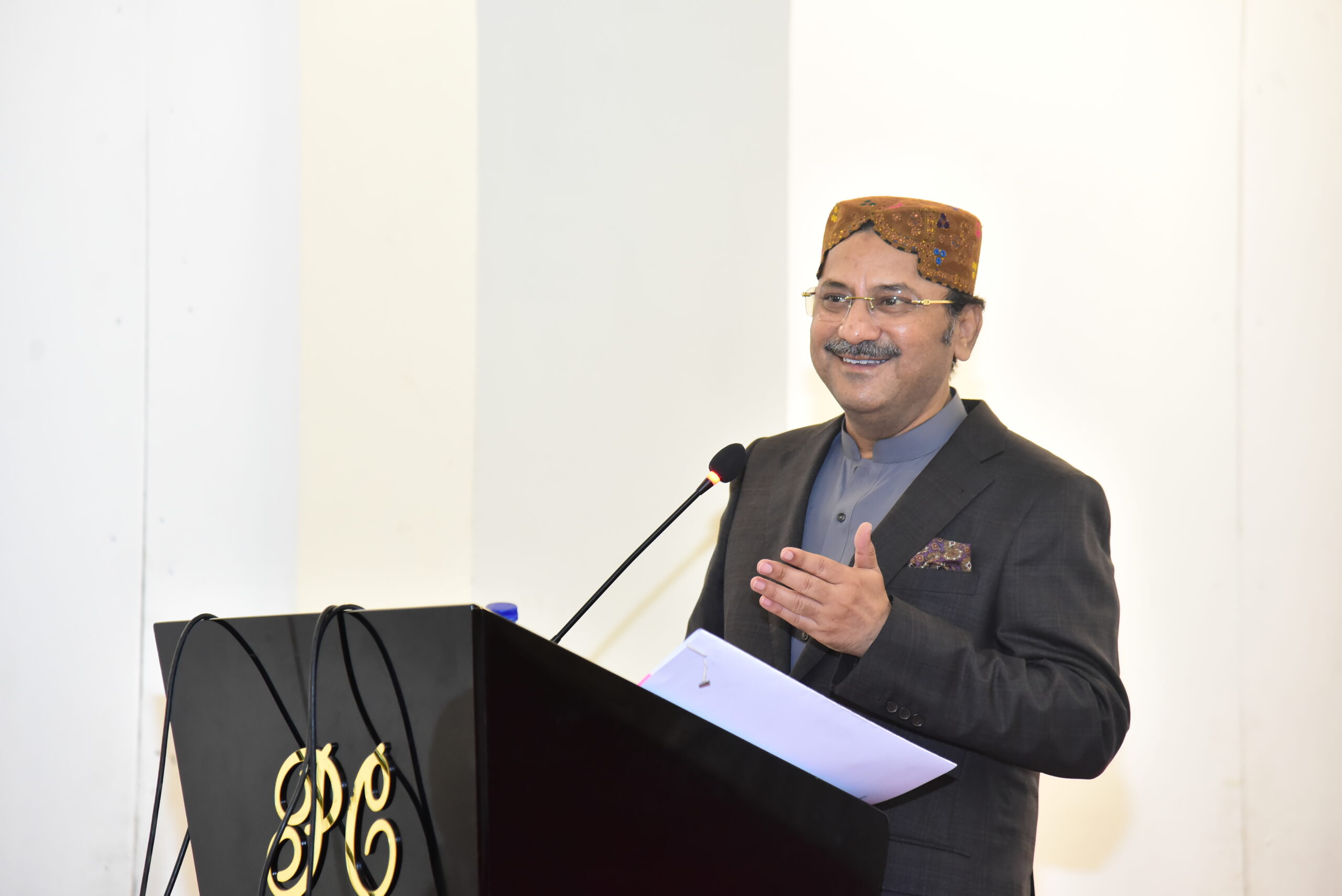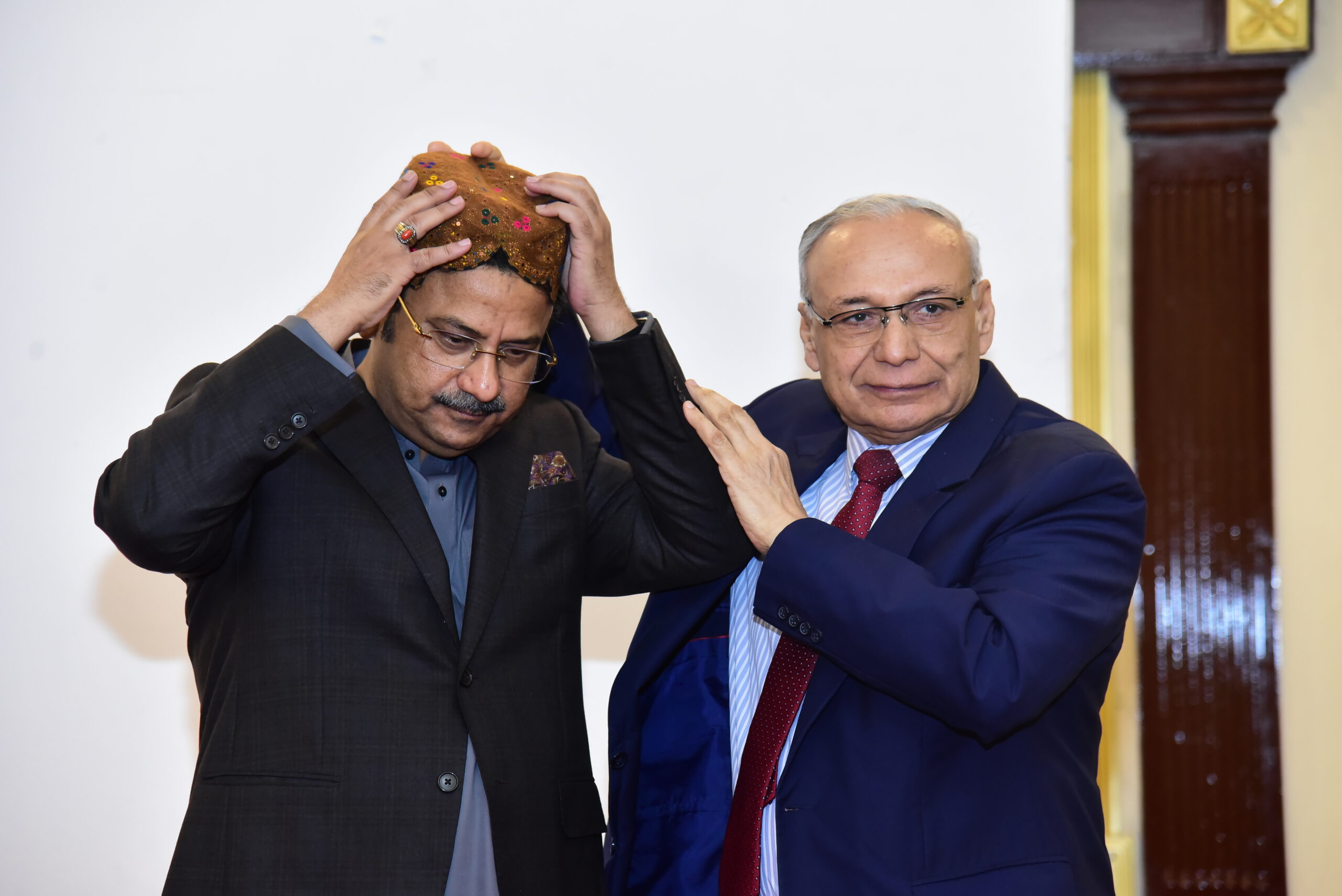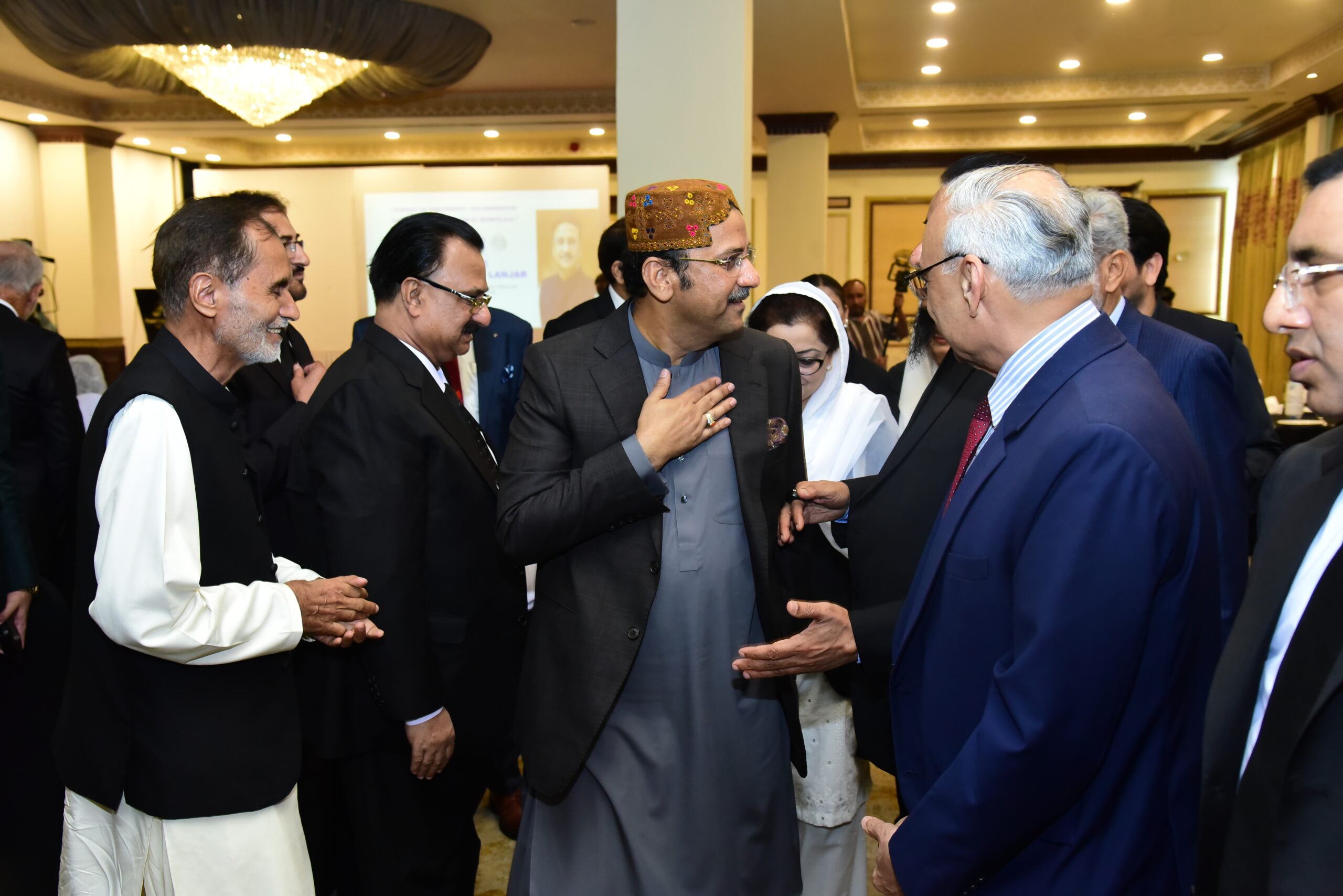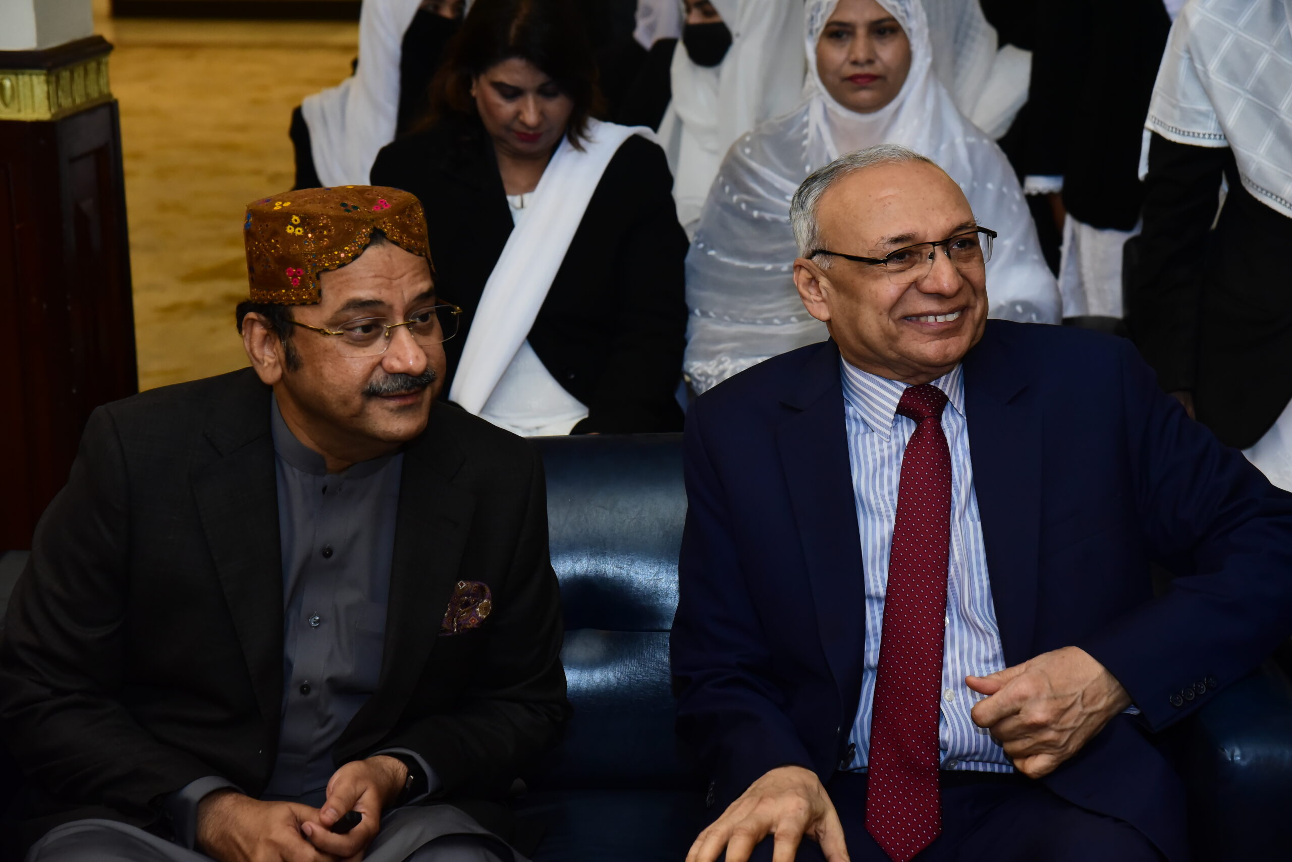 Hon’ble Ombudsman Justice (R) Shahnawaz Tariq presenting Ajrak to Chief Guest Honorable Mr. Zia Ul Hassan Lanjar, Honorable Minister for Home & Law, Parliamentary Affairs and Criminal Prosecution Department Sindh.