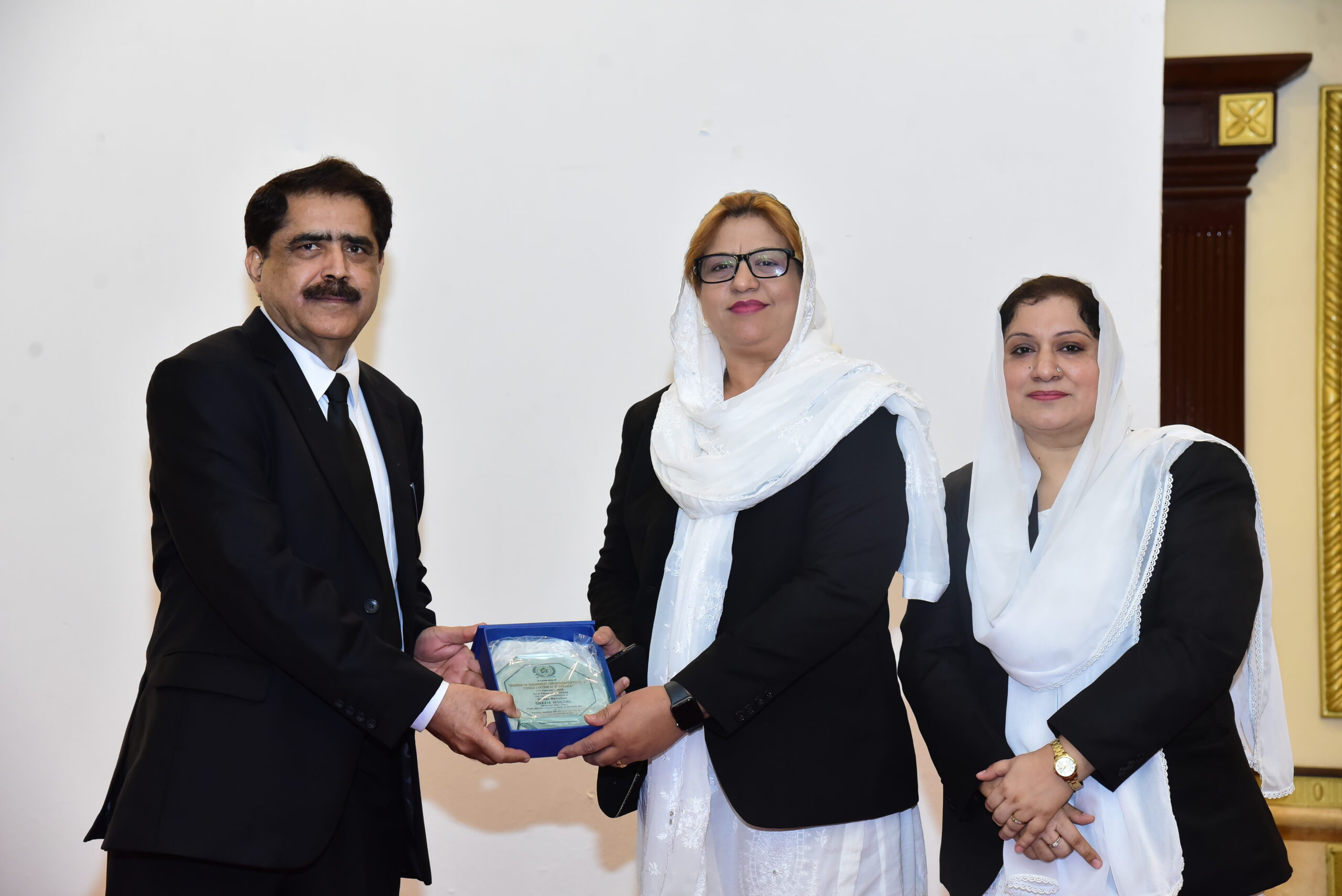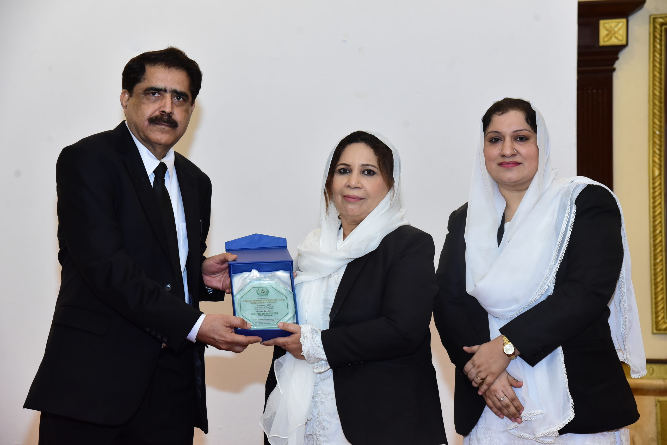Mr. Manthar Ali Jatoi, (Consultant) Provincial Ombudsman (PHWWP) awarding Souvenir to the Guest, Ms. Huma Ikramullah, Advocate, Parliamentary Strengthening Expert.